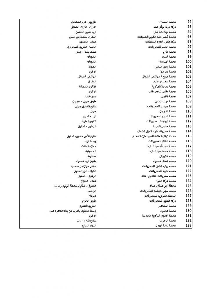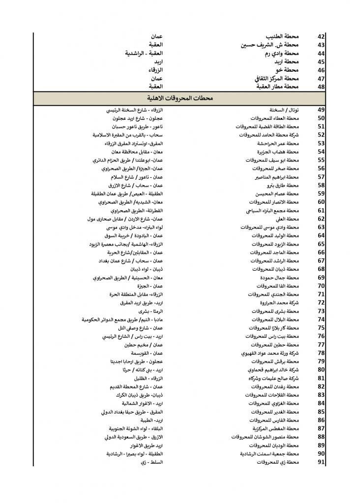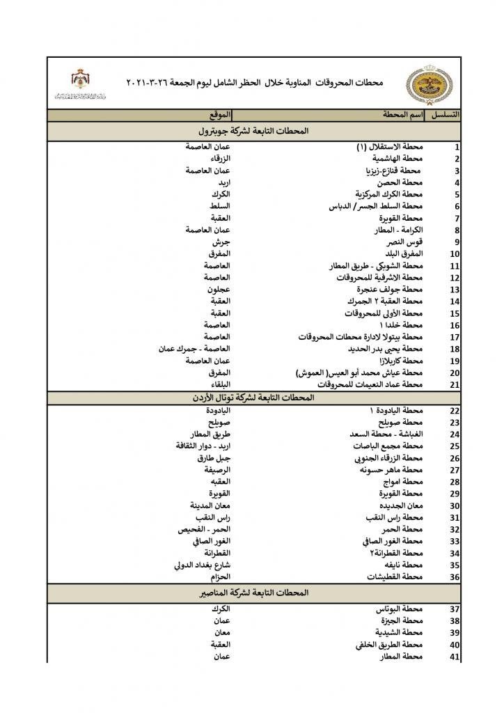 أعلنت وزارة الطاقة والثروة المعدنية الخميس، محطات المحروقات العاملة في حظر التجول الشامل المفروض حتى صباح السبت، للحد من تداعيات فيروس (كورونا المستجد- كوفيد19)، وعددها 133 محطة، موزعة على مختلف مناطق المملكة.