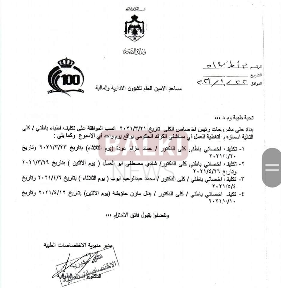 الفراية يوعز بتنفيذ إحتياجات مستشفى الكرك الحكومي من الكوادر الطبية والتمريضية... وثيقة
