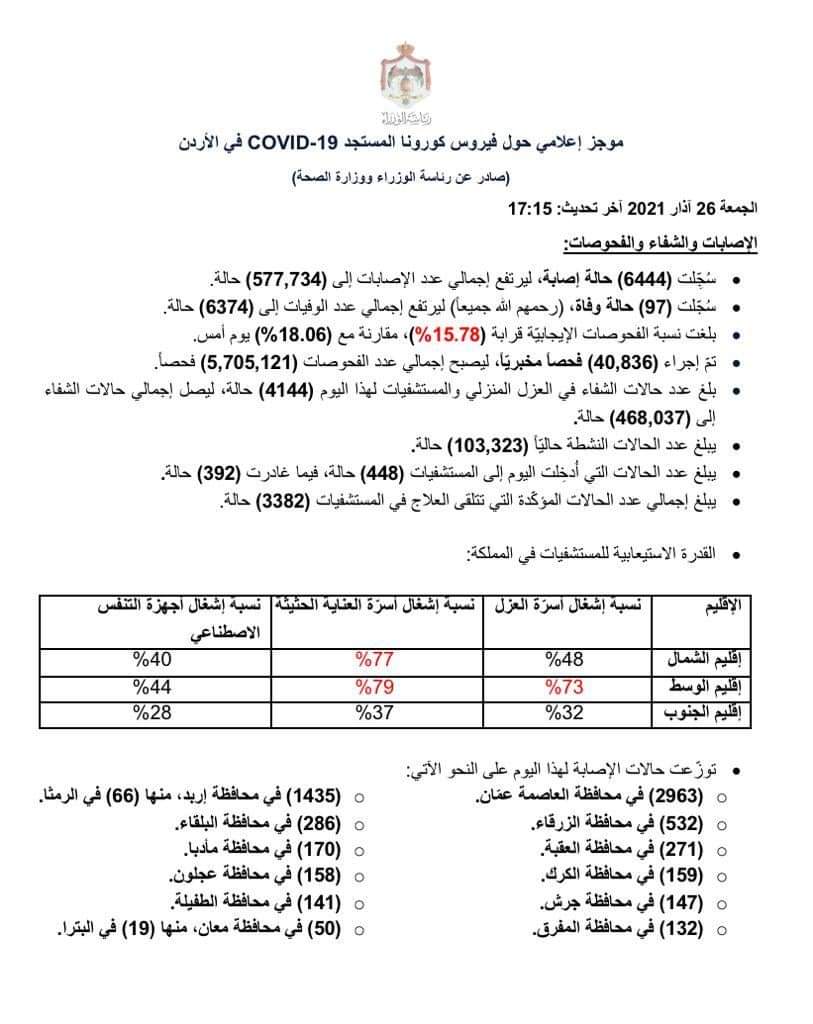 ▪︎سُجّلت (97) حالة وفاة (رحمهم الله جميعاً) ليرتفع إجمالي عدد الوفيات إلى (6374) حالة.
