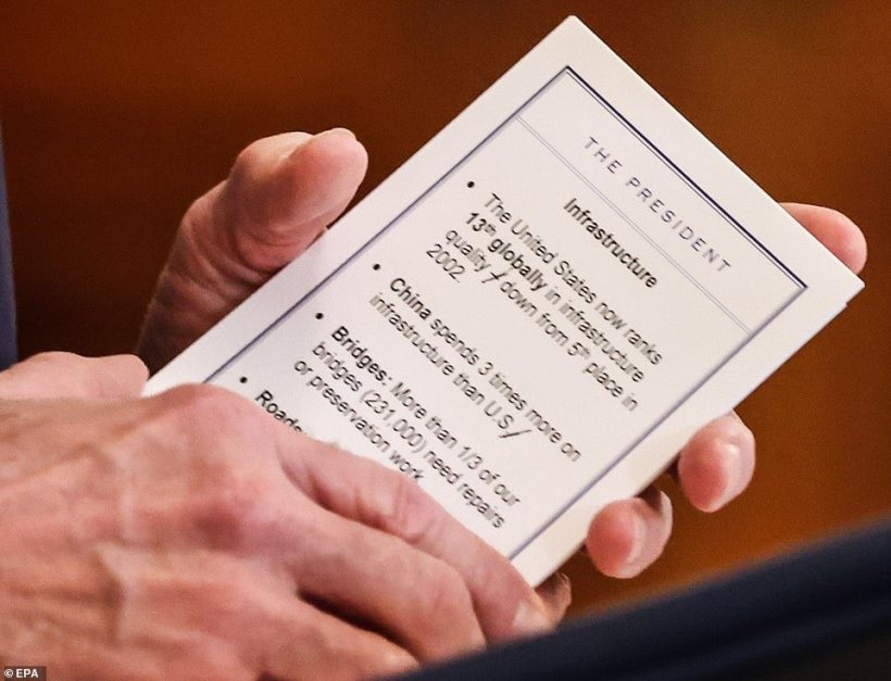 وقالت الصحيفة إن أوراق بايدن شملت صور وأسماء الصحفيين الذين يخطط لمنحهم فرصة لطرح الأسئلة، كما تضمنت نقاط معلومات سريعة، منها أن الولايات المتحدة تحتل المرتبة الثالثة عشرة في قائمة جودة البنية التحتية عالميا، بعد أن كانت في المرتبة الخامسة في عام 2002.