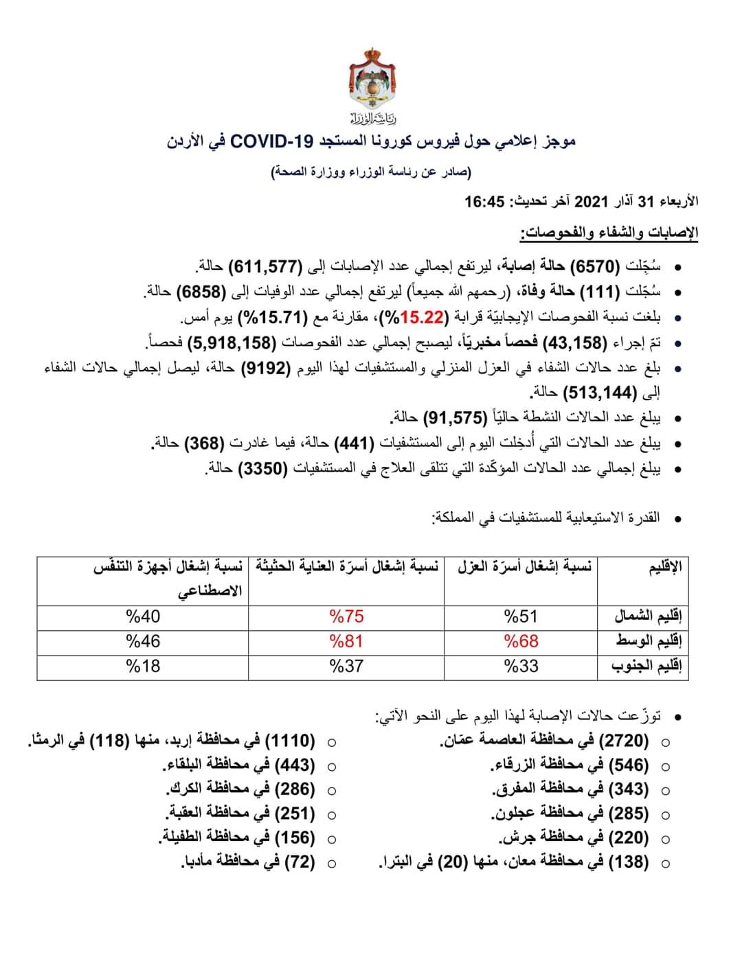 موجز إعلامي حول فيروس كورونا المستجد COVID-19 في الأردن