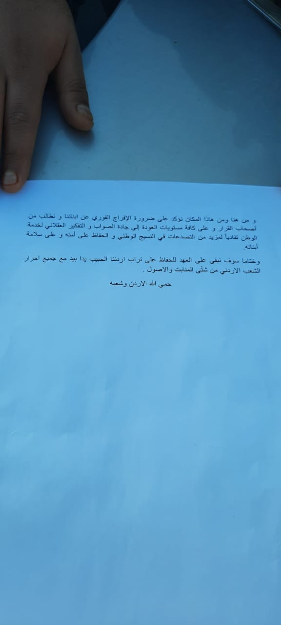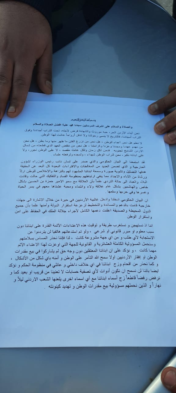 وصدر عن أهالي المعتقلين من أبناء العشائر الأردنية بيان جرى قراءته في الوقفة، وجاء فيه انتقاد للبيان الحكومي الذي تلاه نائب رئيس الوزراء أيمن الصفدي يوم أمس، قائلين إن بيان الحكومة تضمن العديد من المغالطات والافتراءات التي تهدف الى تشويه سمعة أبنائهم.