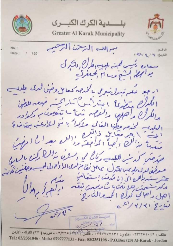 الكركي : يوجه رسالة إلى رئيس لجنة بلدية الكرك"وثيقة"