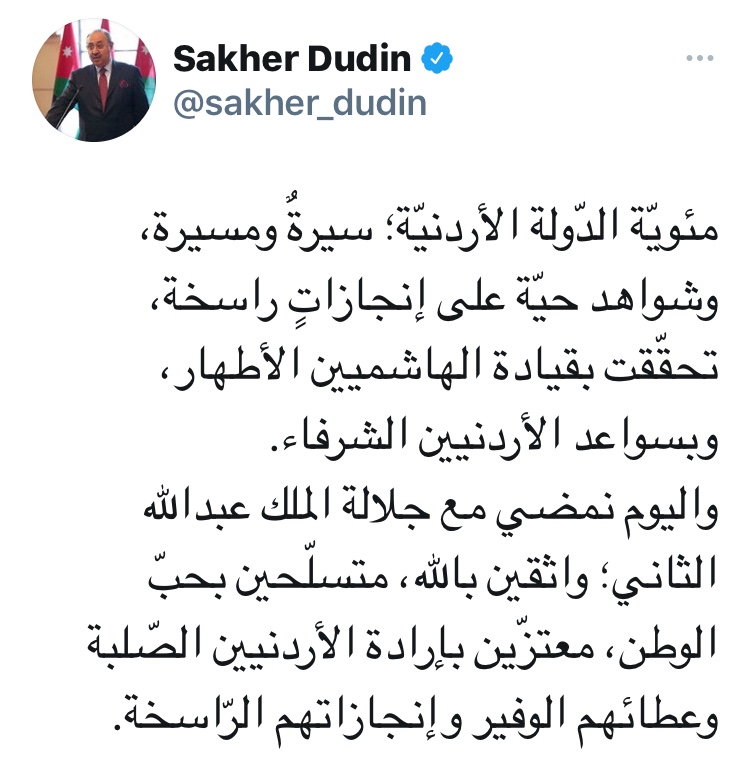 غرد المهندس صخر دودين وزير الأعلام على حسابه الرسمي عبر تويتر بمناسبة مئوية الدولة قائلا :