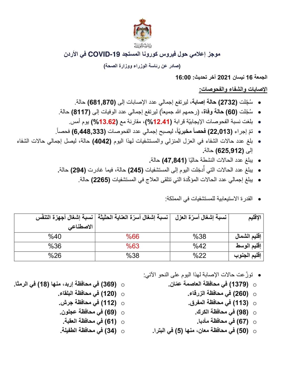 سجل في المملكة اليوم 60 حالة وفاة و 2732 إصابة بفيروس كورونا