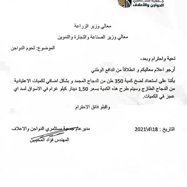 اكد م. خالد الحنيفات وزير الزراعة خلال اجتماع ضم رئيس اتحاد المزارعين ورئيس الاتحاد النوعي للدواجن واعضاء الاتحاد وجمعية الدواجن والاعلاف وشركات الدواجن وممثلي صغار المزارعين على الاتفاق مع القطاع على توريد الدواجن خلال اسبوع وبواقع ١.٨ دينار لكيلو الدجاج الطازج للجملة و١.٦٥ دينار لكيلو دجاج النتافات و١.٥ دينار لكيلو دجاج المجمد .