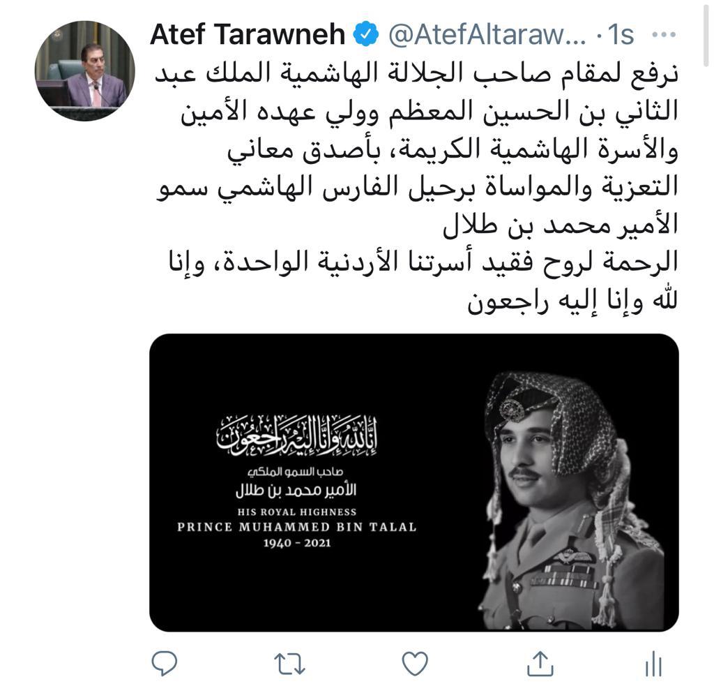 رئيس مجلس النواب السابق المهندس "عاطف الطراونة" ينعى سمو الأمير محمد بن طلال