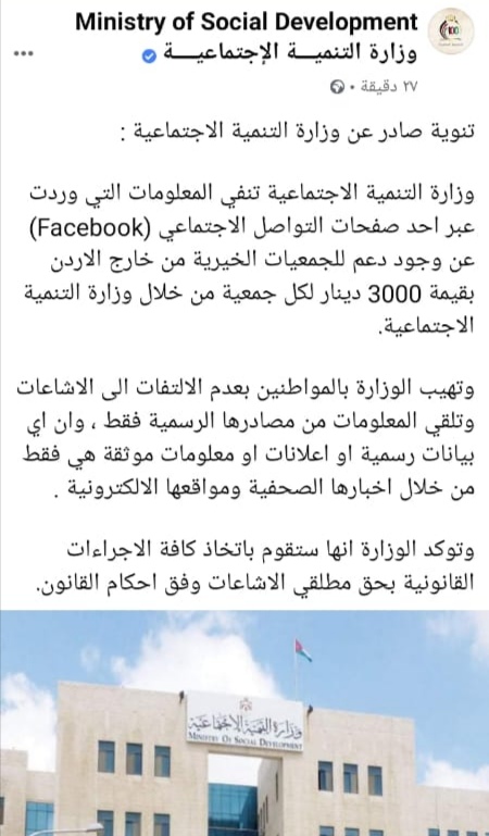 نفت وزارة التنمية الاجتماعية عبر صفحتها على موقع التواصل الاجتماعي فيسبوك المعلومات التي وردت عبر احد صفحات التواصل الاجتماعي (Facebook) عن وجود دعم للجمعيات الخيرية من خارج الاردن بقيمة 3000 دينار لكل جمعية من خلال وزارة التنمية الاجتماعية.