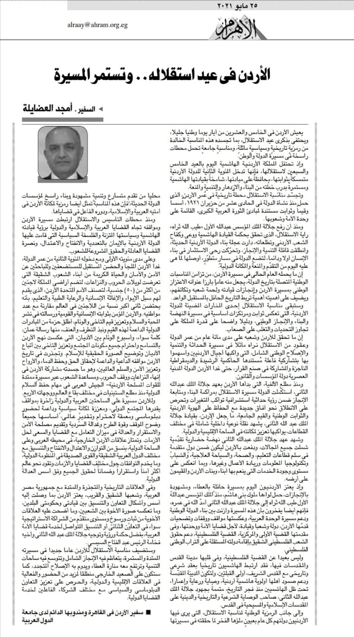 نشر ت صحيفة الأهرام المصرية في صباحية يوم عيد الاستقلال ال ٧٥، مقالاً بقلم السفير الأردني في القاهرة أمجد العضايلة، حمل عنوان "الأردن في عيد استقلاله… وتستمر المسيرة".