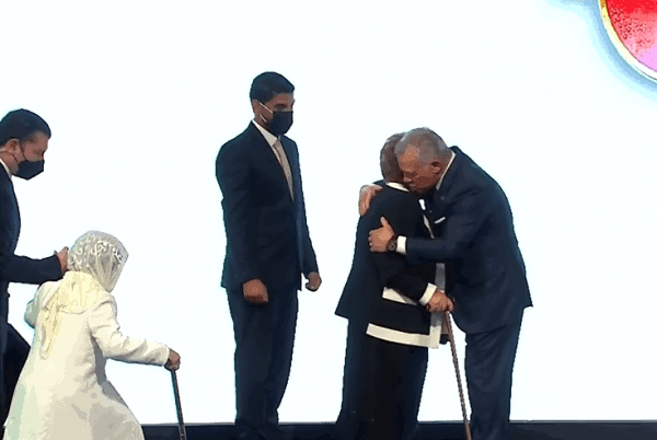 وعانق جلالة الملك السيدة الهام عبدالباقي جمو خلال تسلمها الوسام عن والدها عبدالباقي جمو الشخصية السياسية والدينية والذي شغل مناصب عدة في الدولة.