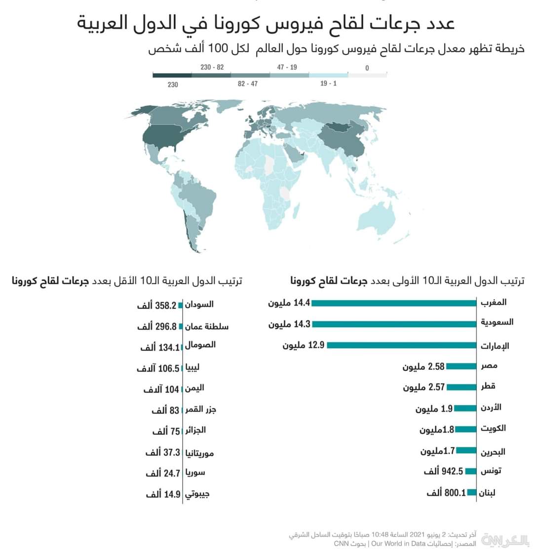 هذا بيان عدد جرعات لقاح كورونا التى تم توزيعها فى الدول العربية عدديا ، حتى صباح يوم الأربعاء 2 يونيو 2021 .ولكن الأهم هو نسبة كل رقم إلى عدد السكان فى كل دولة….. يكون الترتيب يبدأ بالامارات والسعودية والمغرب وقطر والاردن ثم الكويت بنسب أكثر من 10- 15 % … ومصر بنسبة 2% فقط من عدد السكان