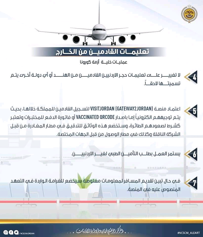 أصدر المركز الوطني للأمن وإدارة الأزمات، عمليات خلية الازمة، التعليمات المحدثة للمسافرين القادمين والمغادرين للمملكة الأردنية الهاشمية.
