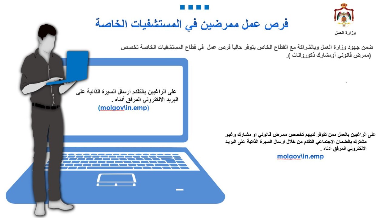 ودعا النهار الراغبين بالعمل ويحملون المؤهل العلمي بتخصص ممرض قانوني أو مشارك وغير مشترك بالضمان الاجتماعي إلى ارسال سيرهم الذاتية على البريد الالكتروني molgovin.emp