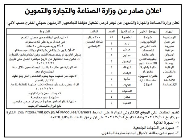أعلنت وزارة الصناعة والتجارة والتموين، عن توفر فرص تشغيل مؤقتة للجامعيين الأردنيين حديثي التخرج.