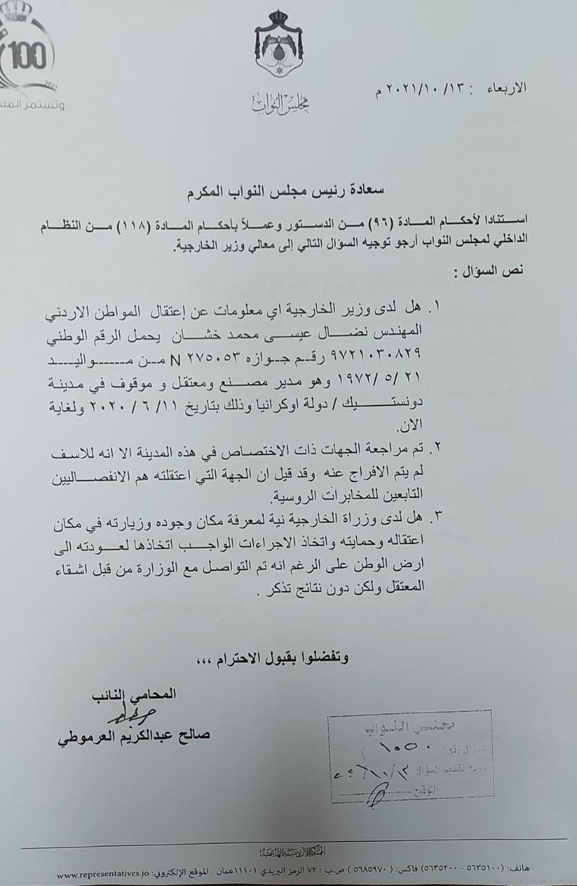 وجه النائب صالح العرموطي سؤالاً لوزير الخارجية أيمن الصفدي، استنادا لأحكام المادة (96) من الدستور وعملاً بأحكام المادة (118) من النظام الداخلي لمجلس النواب، حول اعتقال المواطن الأردني نضال عيسى خشان من قبل السلطات الاوكرانية منذ شهر ايلول 2020 ولغاية هذه اللحظات.