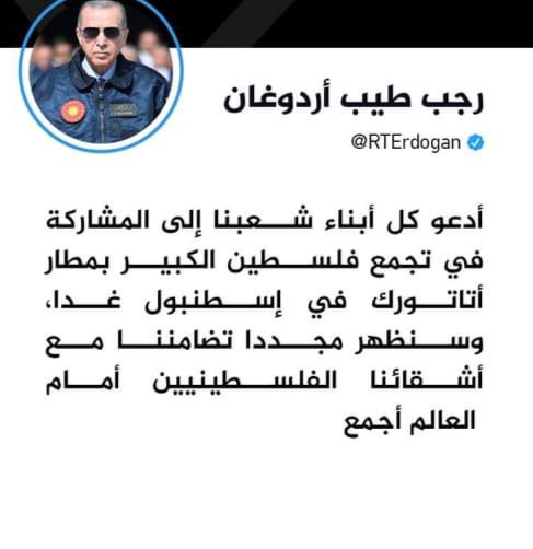 الرئيس التركي رجب طيب #أردوغان، يحث الشعب التركي للمشاركة في تجمع #فلسطين الكبير المقرر تنظيمه بمطار أتاتورك في #إسطنبول غدا السبت.