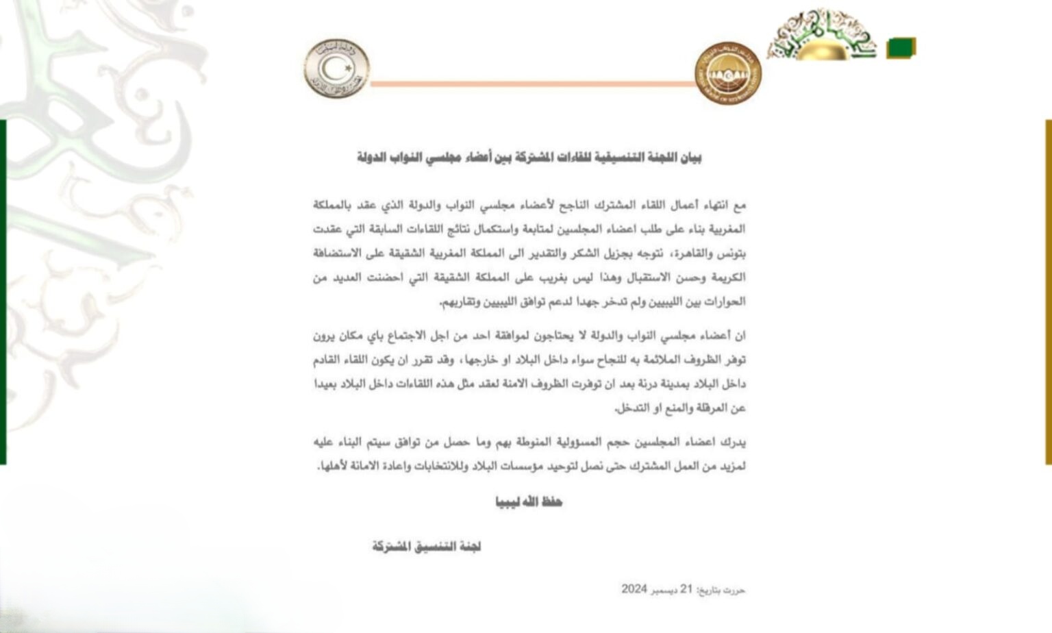 ليبيا:اللجنة التنسيقية المشتركة للقاءات بين النواب والدولة: لا نحتاج لموافقة أحد من أجل الاجتماع بأي مكان.. وثيقة