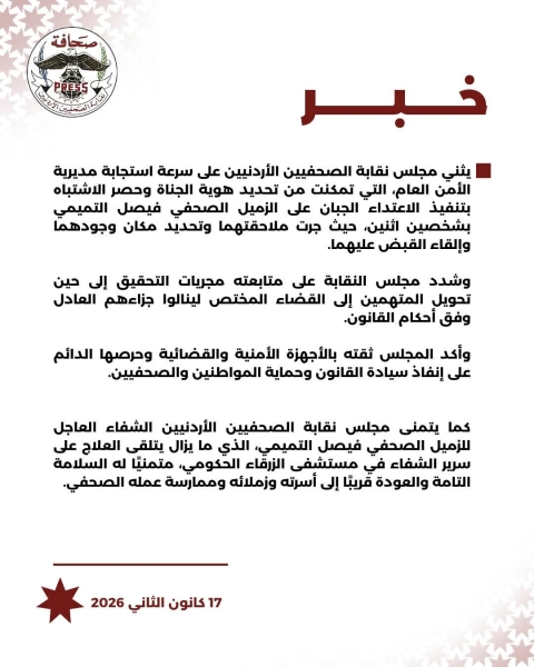 مجلس نقابة الصحفيين يثني على دور الأجهزة الامنيه والقضائية في حماية الصحفيين