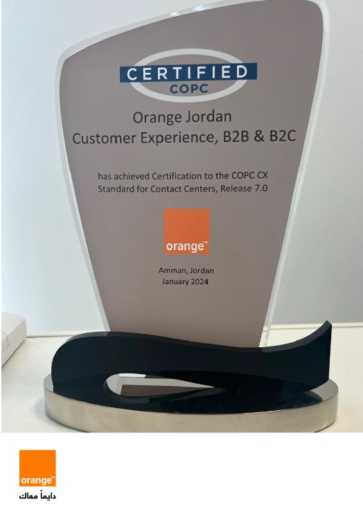للسنة الخامسة على التوالي أورنج الأردن تحصل على شهادة COPC الأولى عالمياً في خدمة الزبائن