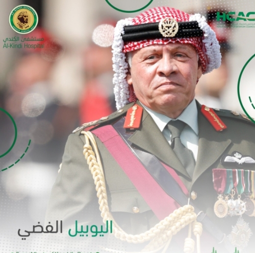مستشفى الكندي يهنئ بمناسبة اليوبيل الفضي لتولي جلالة الملك سلطاته الدستورية ويوم الجيش والثورة العربية الكبرى