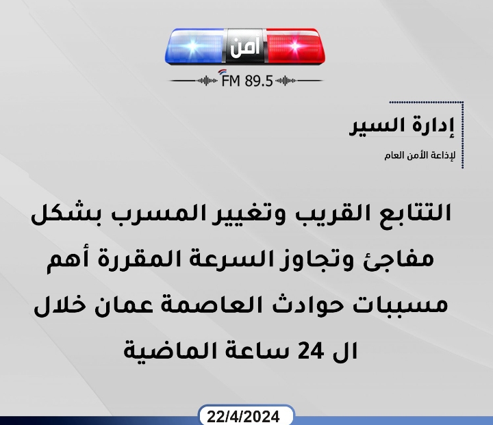 #عاجل التتابع القريب وتغيير المسرب بشكل مفاجئ وتجاوز السرعة المقررة أهم مسببات حوادث العاصمة عمان خلال ال 24 ساعة الماضية