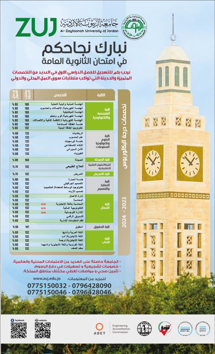 تعلن جامعة الزيتونة الاردنية عن فتح باب القبول والتسجيل للفصل الدراسي الاول لعام 2023-2024