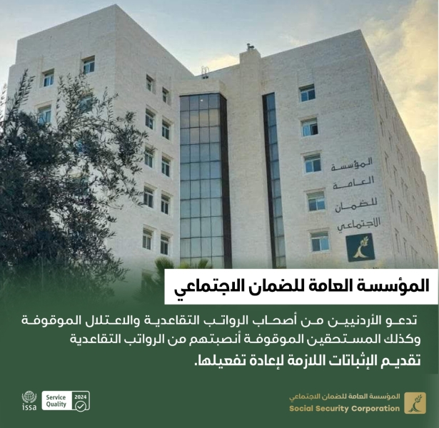 "الضمان" تدعو أصحاب الرواتب التقاعدية والاعتلال الموقوفة تقديم الإثباتات اللازمة