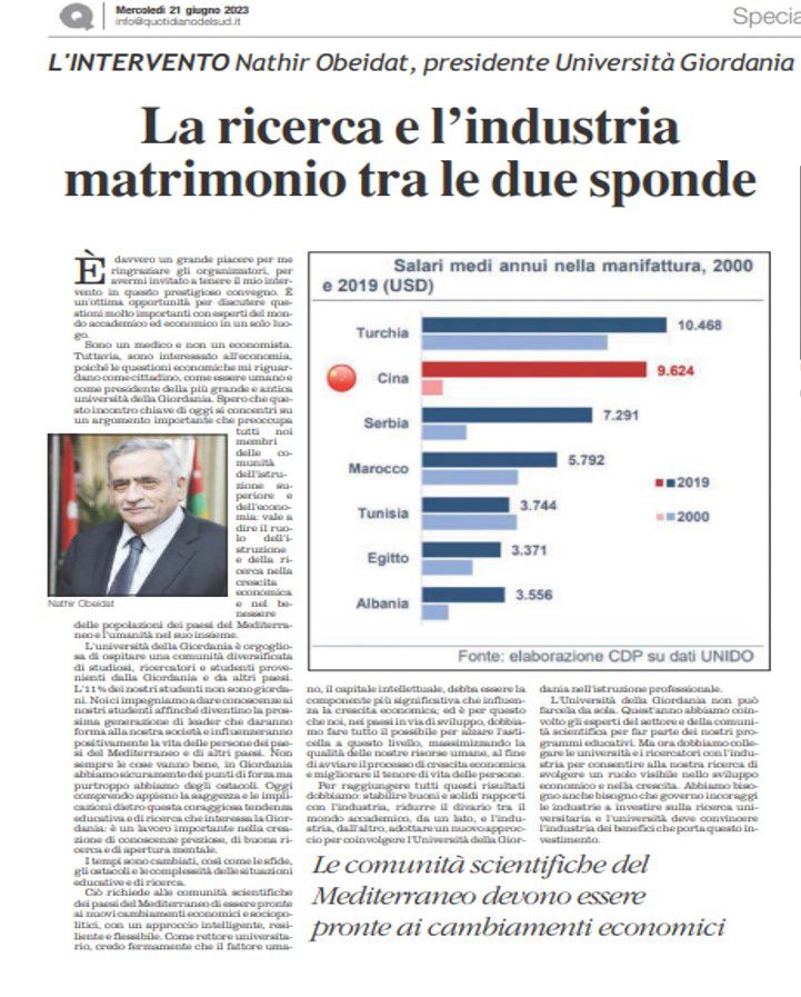 رئيس "الأردنية" في حديث خاص لصحيفة "il Quotidiano del Sud" الإيطالية: رأس المال الفكري من أهم عوامل التأثير على النمو الاقتصادي