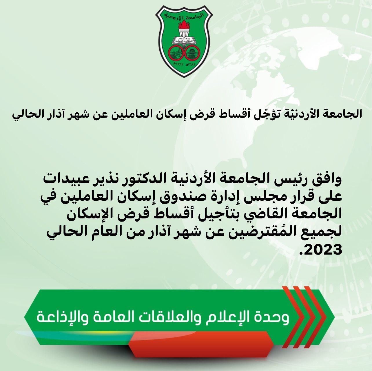 الجامعة الأردنيّة تؤجّل أقساط قرض إسكان العاملين عن شهر آذار الحالي