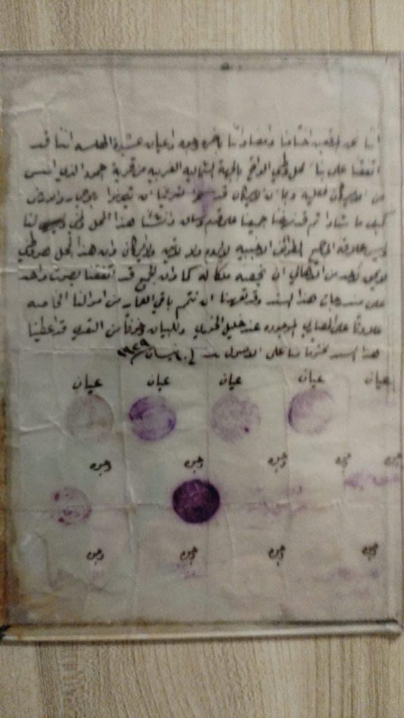 اننا نحن الموقعين اختاما وامضاءاتنا باخره وجوه واعيان عشيرة الهلسه اننا قد اتفقنا على بنا محل وطني الواقع بالجهة الشماليه الغربية من قرية حمود الذي أسس من الامريكان فعليه وبما ان الامريكان قد سمحوا لقريتنا بأن يتصرفوا بالاحجار