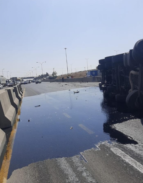 تدهور صهريج محروقات وانقلابه على طريق المطار في العاصمة عمان