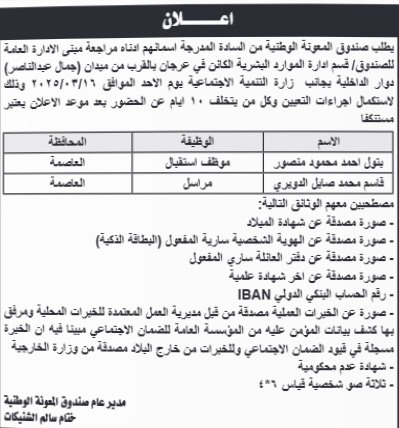 دعا صندوق المعونة الوطنية المدرجة أسمائهم مراجعة الادارة العامة للصندوق لاستكمال اجراءات التعيين يوم الاحد القادم.