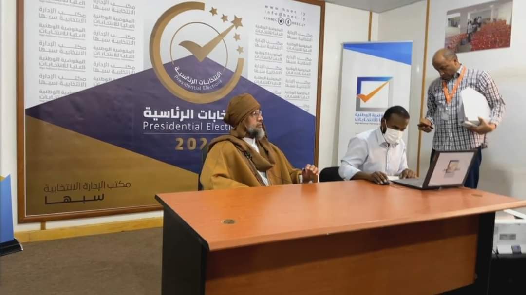 وظهر سيف الإسلام في صور منشورة على وسائل التواصل الاجتماعي بعمامة وعباءة تقليدية بنية اللون وبلحية رمادية ونظارة وهو يوقع وثائق في مركز التسجيل ضمن المرشحين بمدينة سبها بجنوب البلاد.