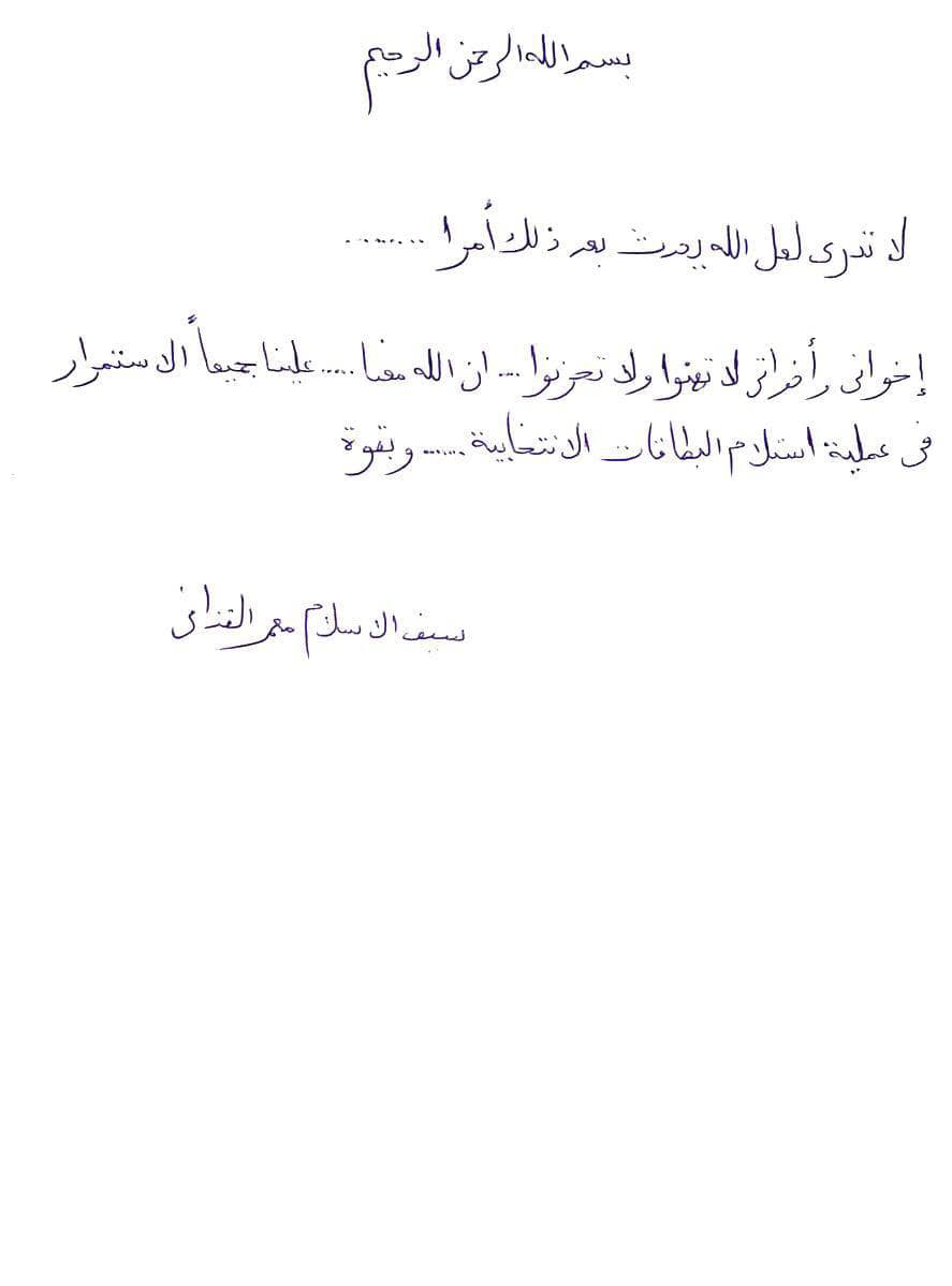 وقال في رسالته "لا تدري لعل الله يحدث بعد ذلك أمرا…إخواني وأخواتي لا تهنوا ولا تحزنوا.. إن الله معنا.. علينا جميعا الاستمرار في عملية استلام البطاقات الانتخابية.. وبقوة".