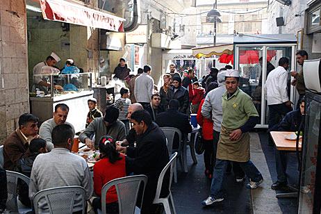 ففي مدينة كانت تنام بعد نشرة أخبار الثامنة مساء، نهض من يوقظ السبات من غفوته، ويطيل عمْر السهر حتى مطلع النهار الموصول بليل لا انقطاع فيه. فالمطعم مفتوح ولا أبواب له، فهو لا يغلق، ولا يعرف الأقفال. وعلى مقاعده البسيطة كان يجلس الناس جميعاً ويتقاسمون الخبز والشاي بالنعناع وحبات الفلافل الخارجة للتو من المقلى الفوّار بالزيت، وكان صوت «أم كلثوم» يشمل الليل بحنانه، فيغدو الجميع إخواناً تغمرهم السكينة والوجع الواحد والآهات الساخنة الفوّارة كالزيت.