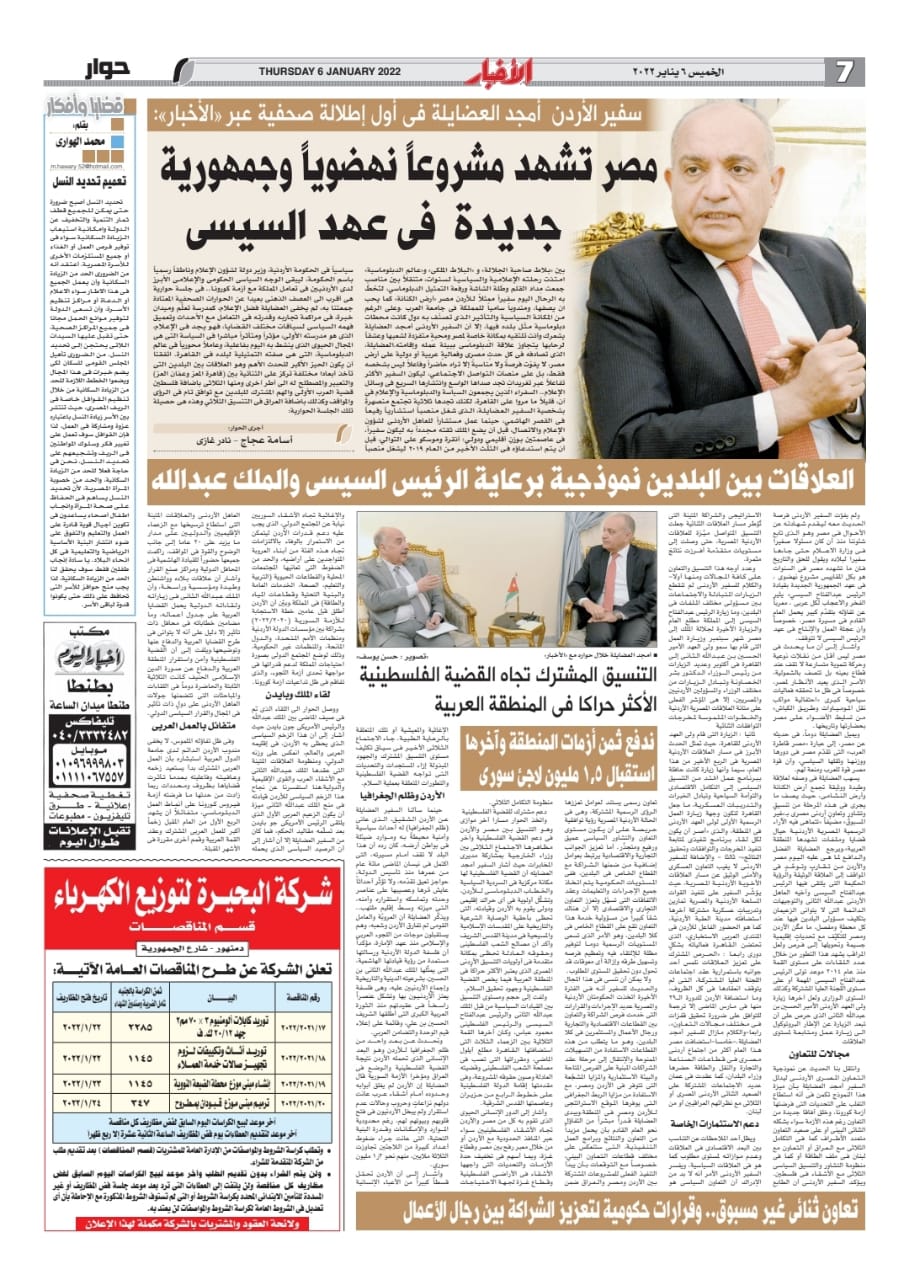ولم يفوّت السفير الأردنى فرصة الحديث معه ليقدم شهادته عن الأحوال فى مصر وهو الذى تابع شئوننا منذ أن كان مسئولا صغيرا فى وزارة الاعلام حتى جاءها سفيرا لبلاده ويقول للحق والتاريخ فان ما تشهده مصر فى السنوات هو بكل المقاييس مشروع نهضوى ، فى عهد الجمهورية الجديدة بقيادة الرئيس عبدالفتاح السيسي» يثير الفخر والاعجاب لكل عربى ، معرباً عن تفاؤله بتقدّم كبير يحمل العام القادم فى مسيرة مصر، خصوصاً وأن عجلة العمل والإنتاج فى عهد الرئيس السيسى لا تتوقف.
