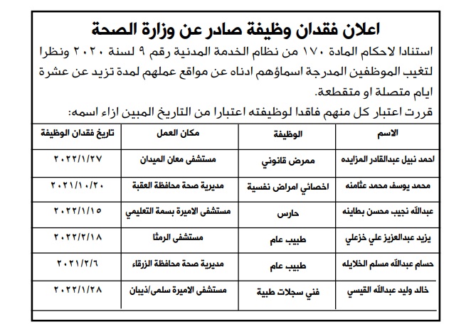 نشرت وزارة الصحة، اليوم الإثنين إعلانا في الصحف اليومية أكدت من خلاله فقدان 6 موظفين لوظائفهم، نظرا لتغيبهم عن مواقع عملهم لمدة تزيد عن 10 أيام متصلة أو متقطعة.