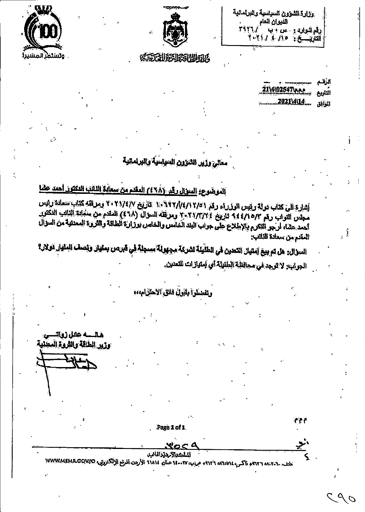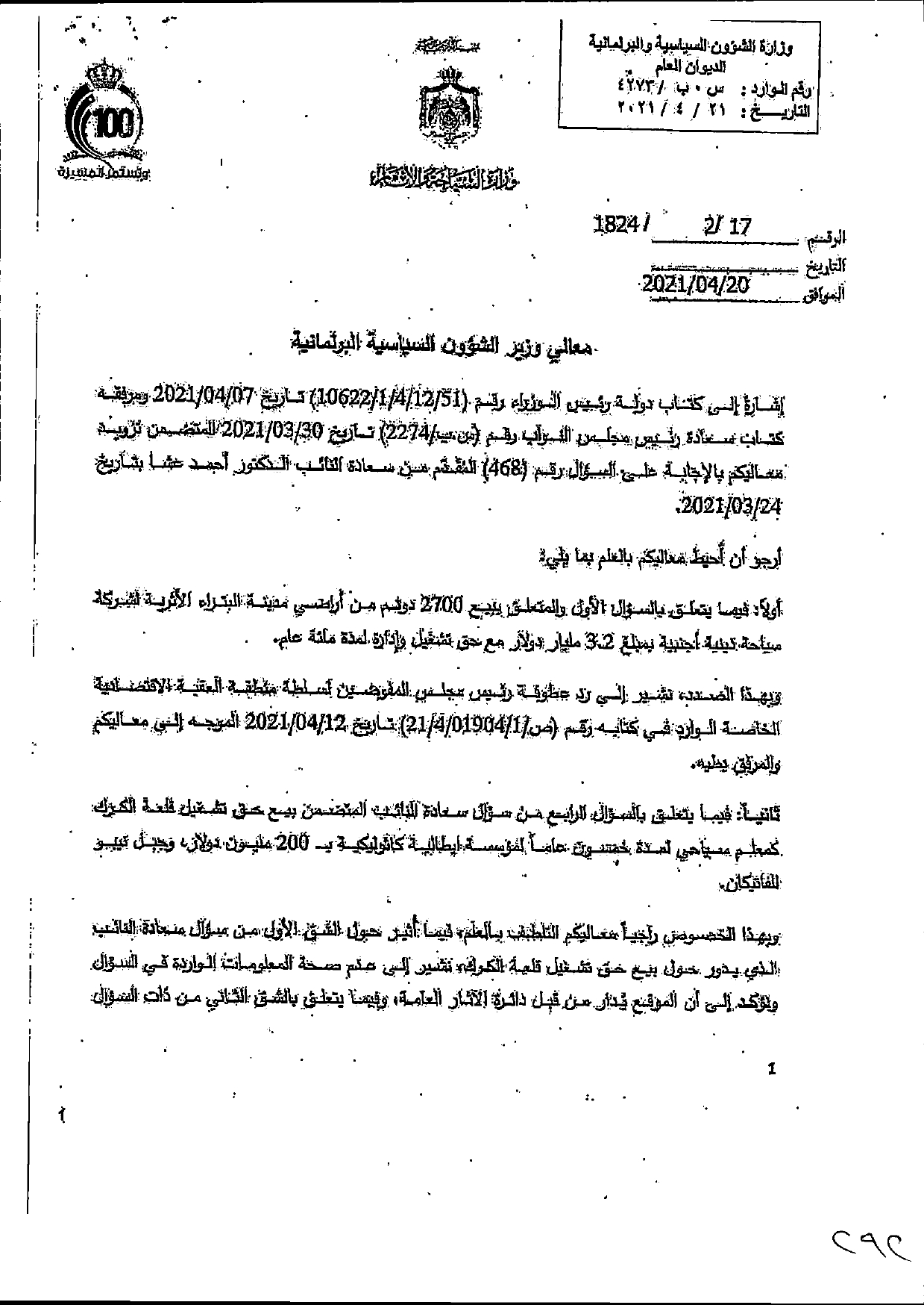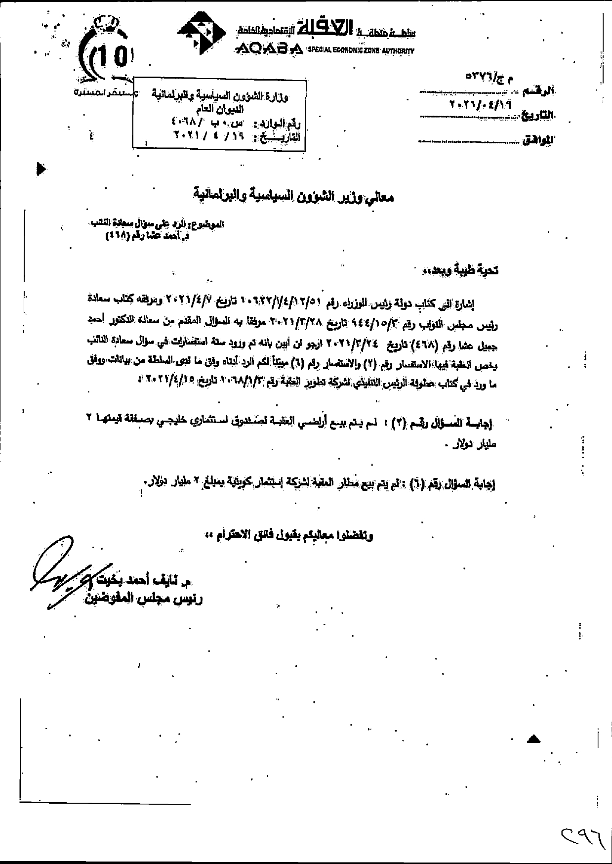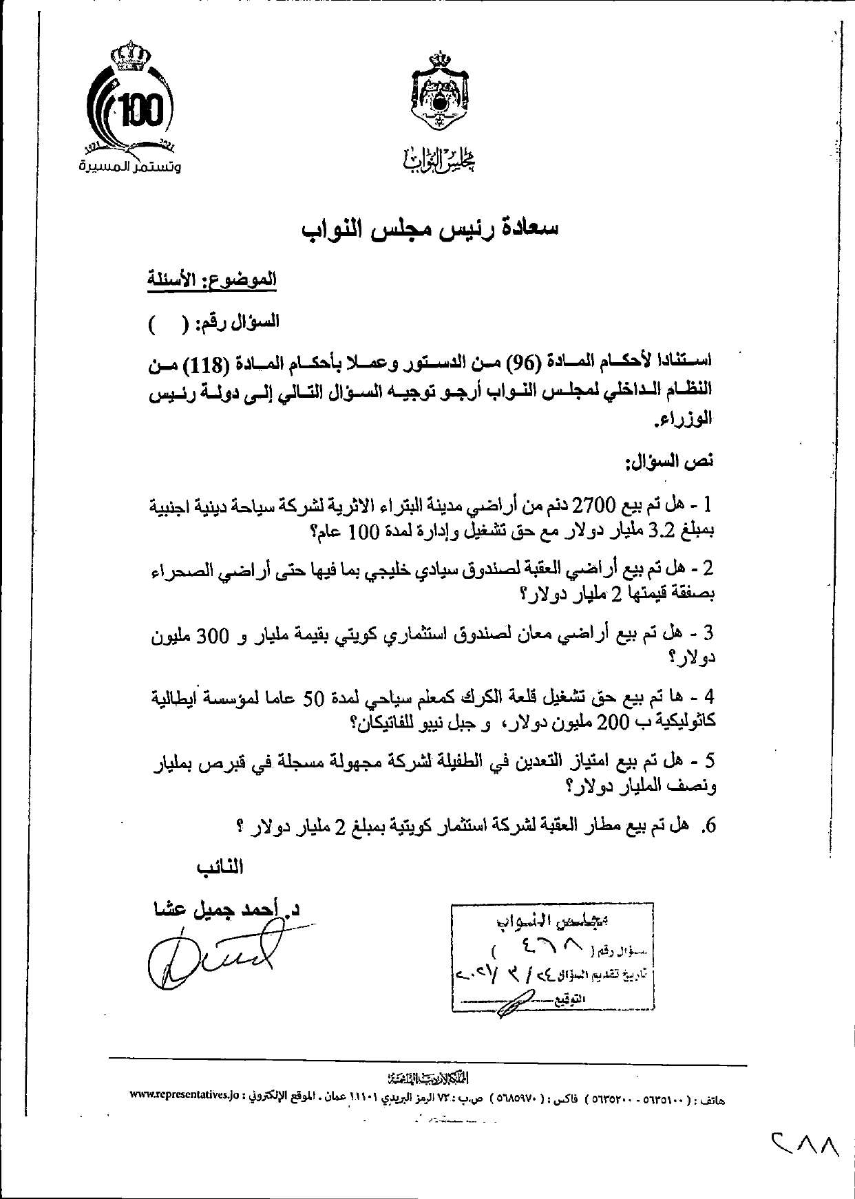جاء رد الحكومة على سؤال نيابي من النائب الدكتور أحمد جميل عشا، تضمن استفسارات عن بيع أراض من مدينة البترا الأثرية ومطار العقبة وأراض في العقبة ومعان، إضافة إلى حق تشغيل قلعة الكرك وجبل نيبو، وامتياز التعدين في الطفيلة.