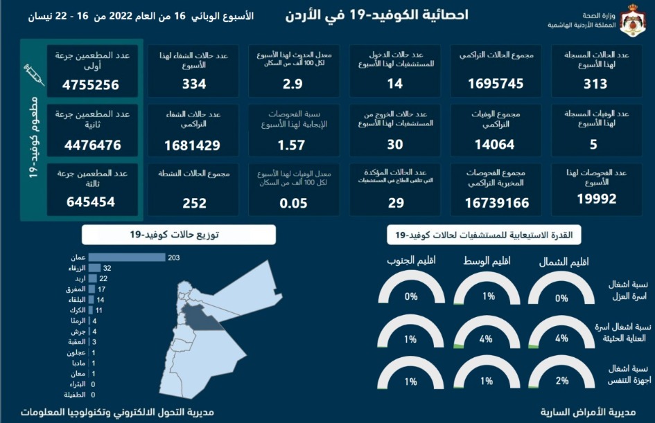 أعلنت وزارة الصحة، عن تسجيل 5 وفيات و313 إصابة بفيروس كورونا في المملكة؛ خلال الأسبوع الوبائي رقم 16 لعام 2022 الممتد من 16 إلى 22 نيسان، ليرتفع العدد الإجمالي منذ بدء الوباء إلى 14064 وفاة و1695745 إصابة.