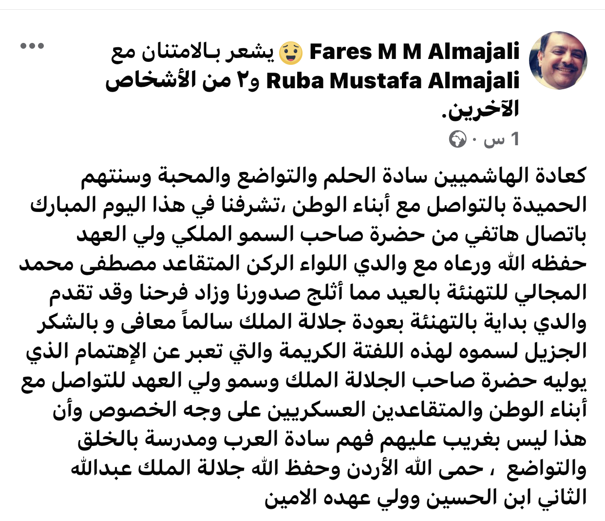كعادة الهاشميين سادة الحلم والتواضع والمحبة وسنتهم الحميدة بالتواصل مع أبناء الوطن ،تشرفنا في هذا اليوم المبارك باتصال هاتفي من حضرة صاحب السمو الملكي ولي العهد حفظه الله ورعاه مع والدي اللواء الركن المتقاعد مصطفى محمد المجالي للتهنئة بالعيد مما أثلج صدورنا وزاد فرحنا وقد تقدم والدي بداية بالتهنئة بعودة جلالة الملك سالماً معافى و بالشكر الجزيل لسموه لهذه اللفتة الكريمة والتي تعبر عن الإهتمام الذي يوليه حضرة صاحب الجلالة الملك وسمو ولي العهد للتواصل مع أبناء الوطن والمتقاعدين العسكريين على وجه الخصوص وأن هذا ليس بغريب عليهم فهم سادة العرب ومدرسة بالخلق والتواضع ، حمى الله الأردن وحفظ الله جلالة الملك عبدالله الثاني ابن الحسين وولي عهده الامين