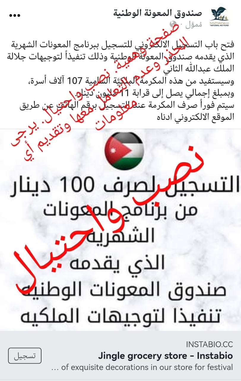 وقال مدير عام صندوق المعونة الوطنية بالوكالة أمين عام وزارة التنمية الاجتماعية، الدكتور برق الضمور إن المحتالين يرسلون رسائل لبعض المواطنين بضرورة فتح محفظة إلكترونية وإيداع مبلغ مالي فيها ليتم تحويل الدعم النقدي لهم، فيما تقوم صفحة مزورة بنشر رقم هاتف تدعي فيه بأن الصندوق سيتواصل معهم بعد اتصالهم بالرقم ، كما تدعي بعض الصفحات الوهمية المزورة التسجيل لمكرمة ملكية .