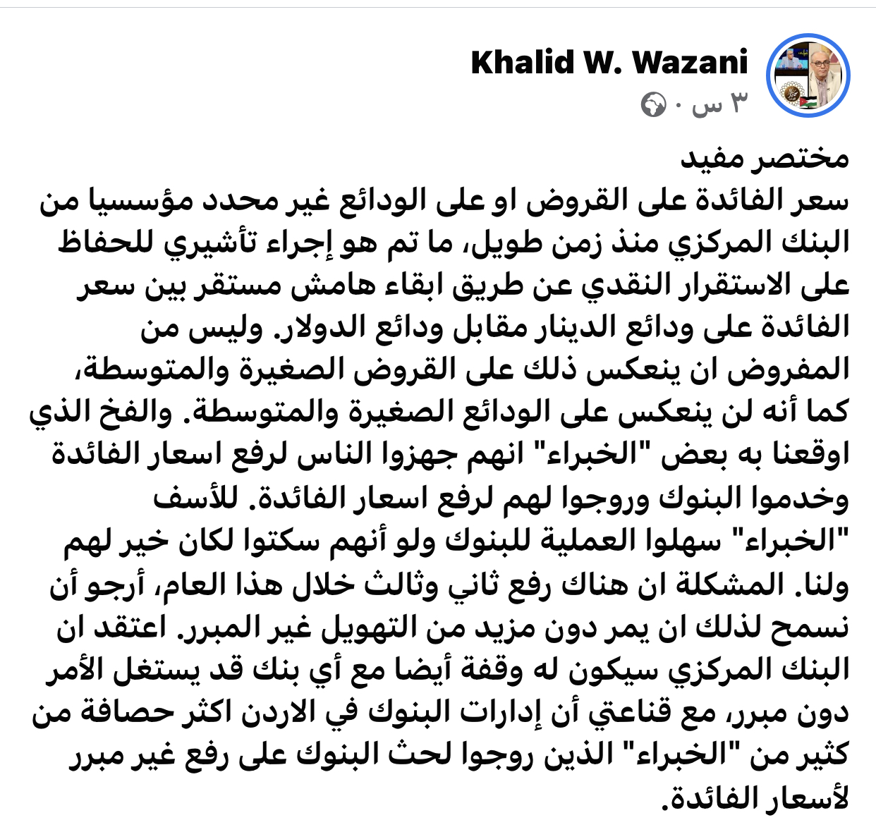 سعر الفائدة على القروض او على الودائع غير محدد مؤسسيا من البنك المركزي منذ زمن طويل، ما تم هو إجراء تأشيري للحفاظ على الاستقرار النقدي عن طريق ابقاء هامش مستقر بين سعر الفائدة على ودائع الدينار مقابل ودائع الدولار. وليس من المفروض ان ينعكس ذلك على القروض الصغيرة والمتوسطة، كما أنه لن ينعكس على الودائع الصغيرة والمتوسطة. والفخ الذي اوقعنا به بعض "الخبراء" انهم جهزوا الناس لرفع اسعار الفائدة وخدموا البنوك وروجوا لهم لرفع اسعار الفائدة. للأسف "الخبراء" سهلوا العملية للبنوك ولو أنهم سكتوا لكان خير لهم ولنا. المشكلة ان هناك رفع ثاني وثالث خلال هذا العام، أرجو أن نسمح لذلك ان يمر دون مزيد من التهويل غير المبرر. اعتقد ان البنك المركزي سيكون له وقفة أيضا مع أي بنك قد يستغل الأمر دون مبرر، مع قناعتي أن إدارات البنوك في الاردن اكثر حصافة من كثير من "الخبراء" الذين روجوا لحث البنوك على رفع غير مبرر لأسعار الفائدة.