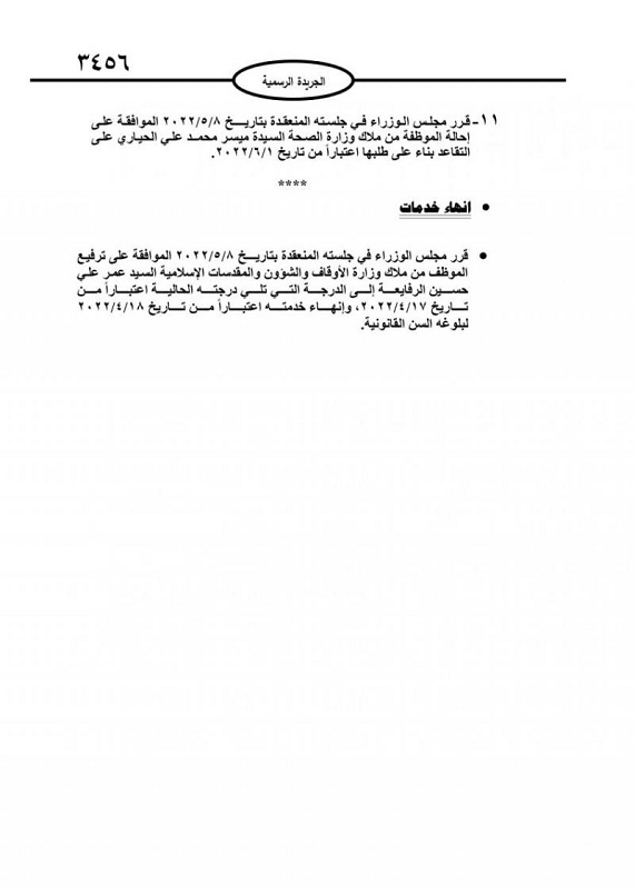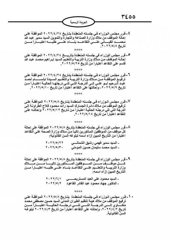صدر في عدد الجريدة الرسمية اليوم الإثنين قرارت مجلس الوزراء بإحالة موظفين حكوميين الى التقاعد، وانهاء خدمات اخرين.