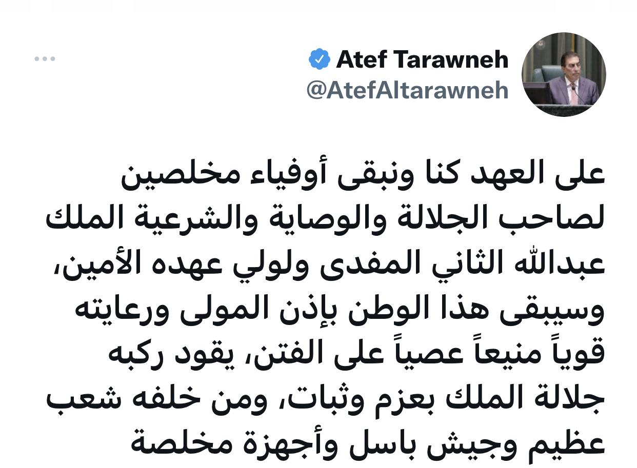 على العهد كنا ونبقى أوفياء مخلصين لصاحب الجلالة والوصاية والشرعية الملك عبدالله الثاني المفدى ولولي عهده الأمين، وسيبقى هذا الوطن بإذن المولى ورعايته قوياً منيعاً عصياً على الفتن، يقود ركبه جلالة الملك بعزم وثبات، ومن خلفه شعب عظيم وجيش باسل وأجهزة مخلصة