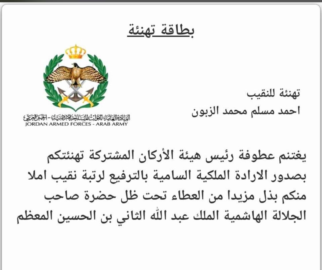 تتقدم الدكتورة مرام العبادي من الغالية ملازم اول ايمان الوريكات و زوجها النقيب الطبيب الدكتور احمد الزبون بأحر التهاني و التبريكات بمناسبة صدور الارادة الملكية السلمية بترفيعهما متمنيةً لهما مزيداً من التقدم و النجاح في ظل الراية الهاشمية