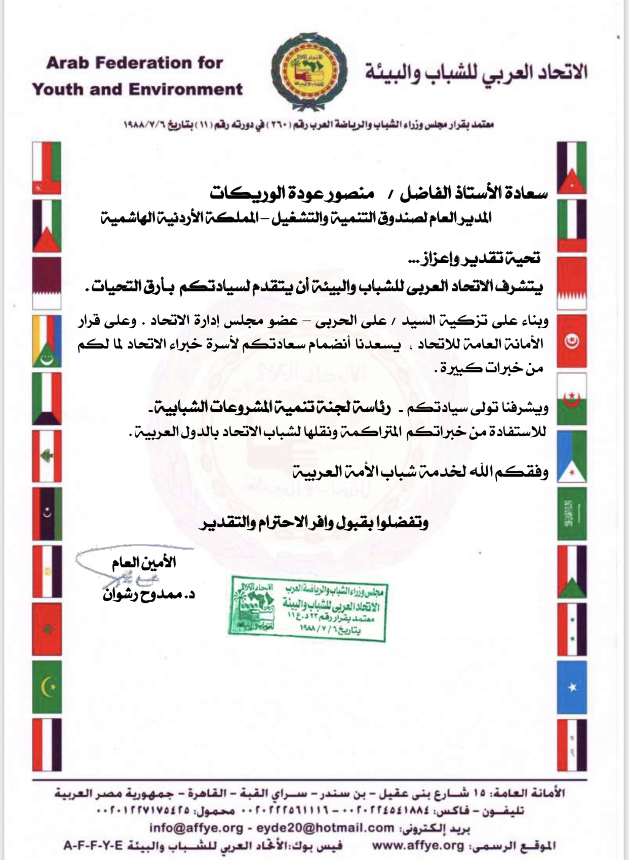 منصور وريكات رئيسا للجنة تنمية المشروعات الشبابية في الاتحاد العربي للشباب والبيئة بالتزكية .