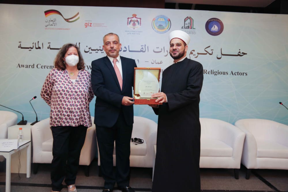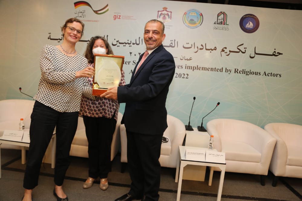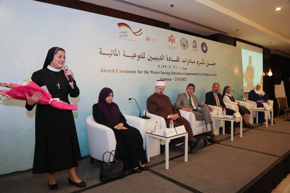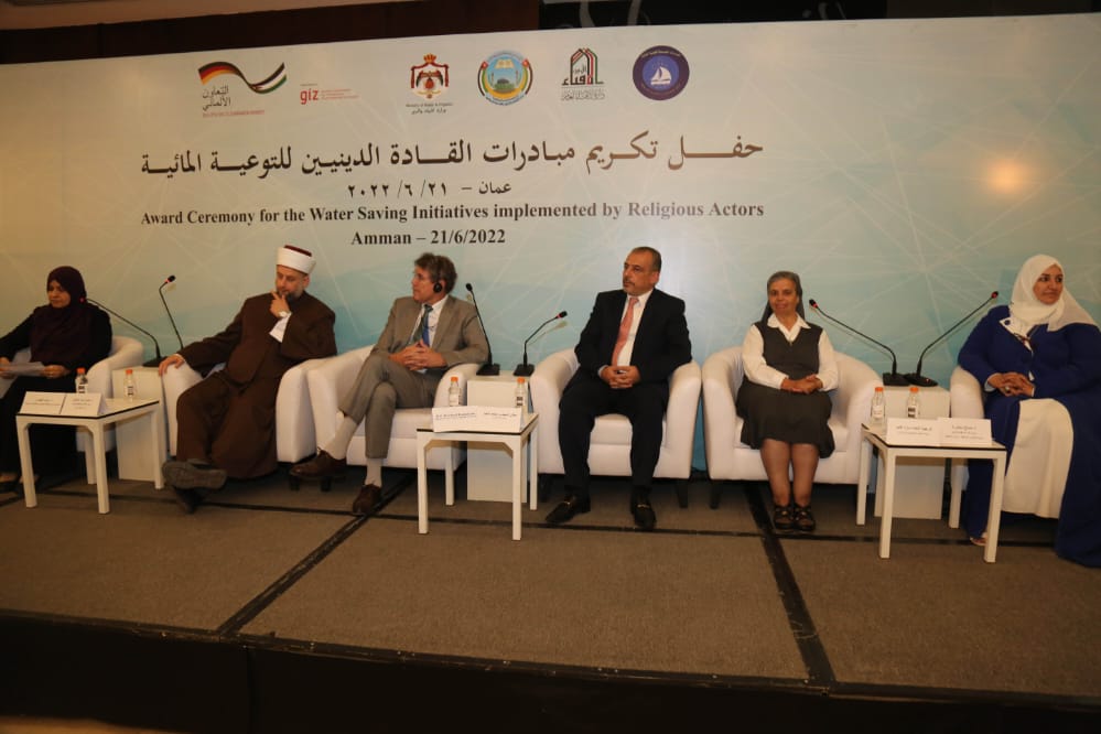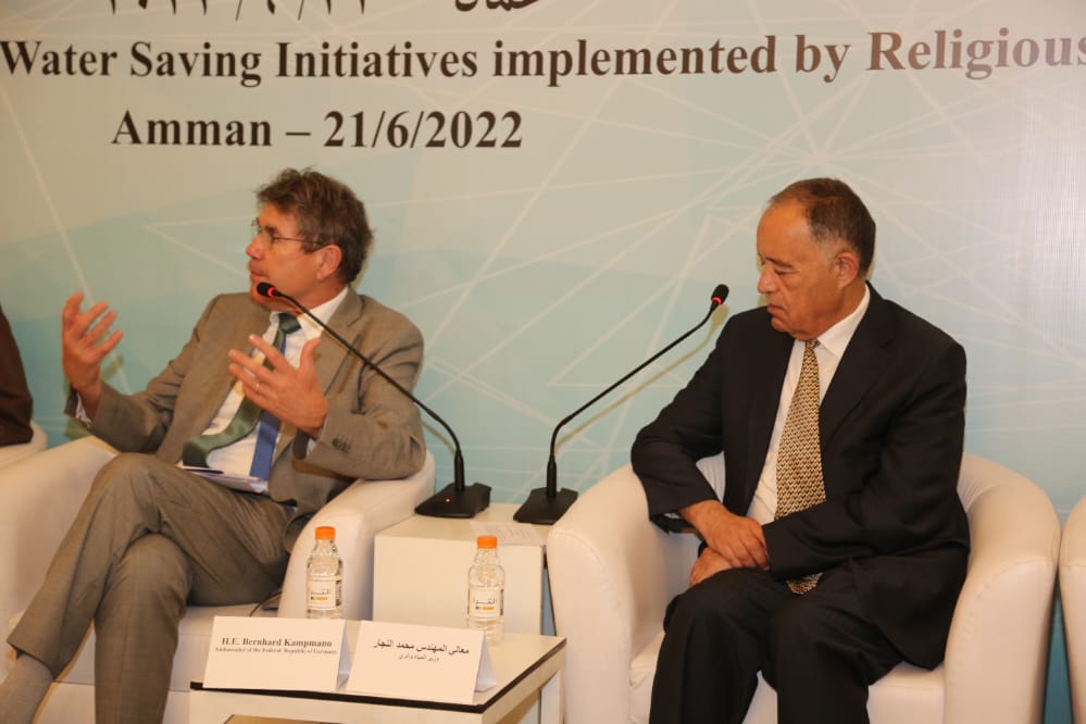 رعى المهندس محمد النجار وزير المياه والري بحضور سفير جمهورية ألمانيا الاتحادية السيد برنهارد كامبمان وامين عام سلطة المياه المهندس بشار البطاينة وامين عام سلطة وادي الاردن المهندسة منار محاسنة وممثلة التعاون الدولي الالماني مدير مكتب GIZ الأردن إليزابيث جيرباخ ومديرة مكتب المياه في الـ GIZ فراوكا نيومان وامين عام دائرة الإفتاء العام السيد أحمد الحسنات وعدد من كبار موظفي قطاع المياه ورجال الدين الاسلامي والمسيحي والواعظات والراهبات اليوم الثلاثاء 21/6/2022 في فندق الاند مارك حفل تكريم ل مبادرات توفير المياه التي نفذتها الجهات الدينية بدعم من التعاون الدولي الألماني ال giz نيابة عن الوزارة الالمانية الاتحادية للتعاون الاقتصادي والتنمية BMZ بالتعاون مع وزارة المياه والري والهيئات الدينية ووزارة الأوقاف والشؤون والمقدسات الاسلامية ودائرة الافتاء العام ومجلس الكنائس ضمن مشروع تحسين كفاءة استخدام المياه المجتمعي.