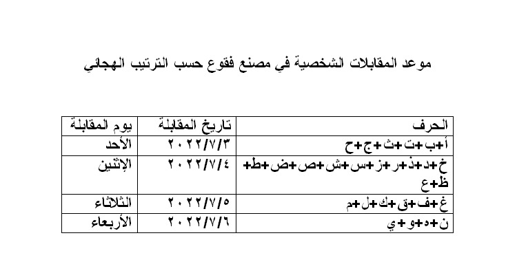 وأشارت الوزارة إلى أن إجراء المقابلات سيكون للشباب الذكور لمدة 4 ايام اعتبارا من يوم الأحد المقبل الموافق 2022/7/3 وحتى يوم الأربعاء الموافق 2022/7/6 وحسب الترتيب الهجائي في الجدول المرفق.