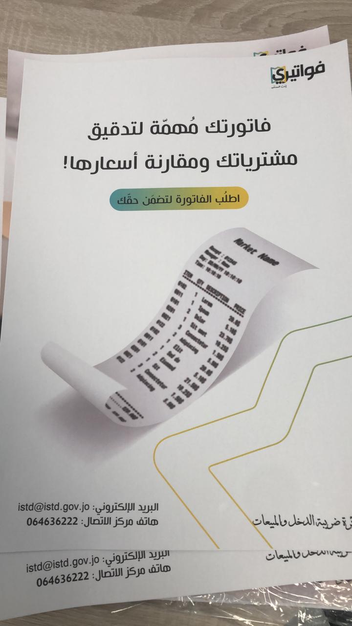 بدأت دائرة ضريبة الدخل والمبيعات حملة توعوية حول ثقافة طلب الفاتورة لتشجيع المواطنين والمكلَّفين على طلب فواتير والحصول عليها مقابل كل عملية شراء سلعة أو دفع أي بدل مقابل تلقي خدمة وبما يساهم في التشجيع على تطبيق نظام الفوترة .