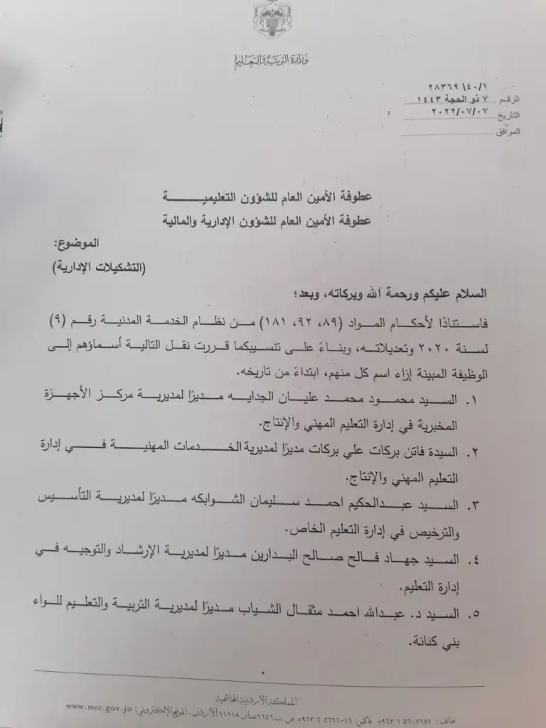 وتأتي التنقلات، استنادا لأحكام المواد (89، 92، 181) من نظام الخدمة المدنية رقم (9) لسنة 2020 وتعديلاته.